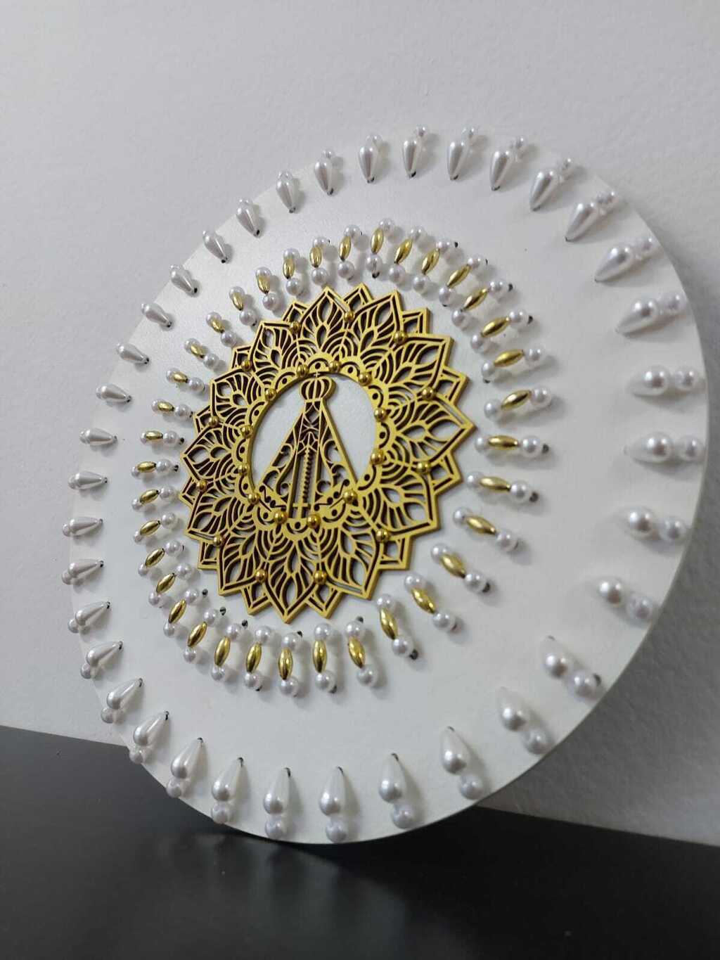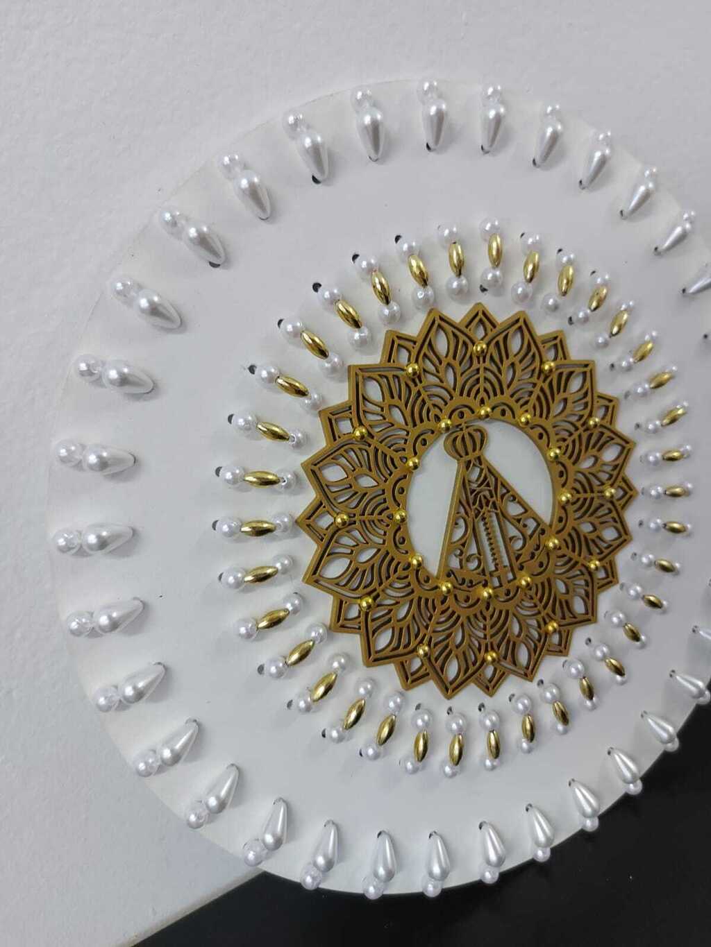 ? Detalhes Sofisticados: Cada pérola é cuidadosamente colocada, criando um design que reflete a beleza e a devoção. A mandala é perfeita para adornar a sua casa ou dar de presente a alguém especial.